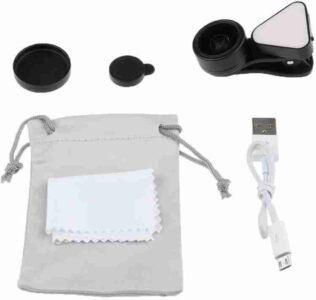 يشتمل المنتج على: عدسة مقربة واحدة ومشبك واحد وقطعة قماش واحدة للتنظيف + فلاش أضائة + وصلة usb للشحن
